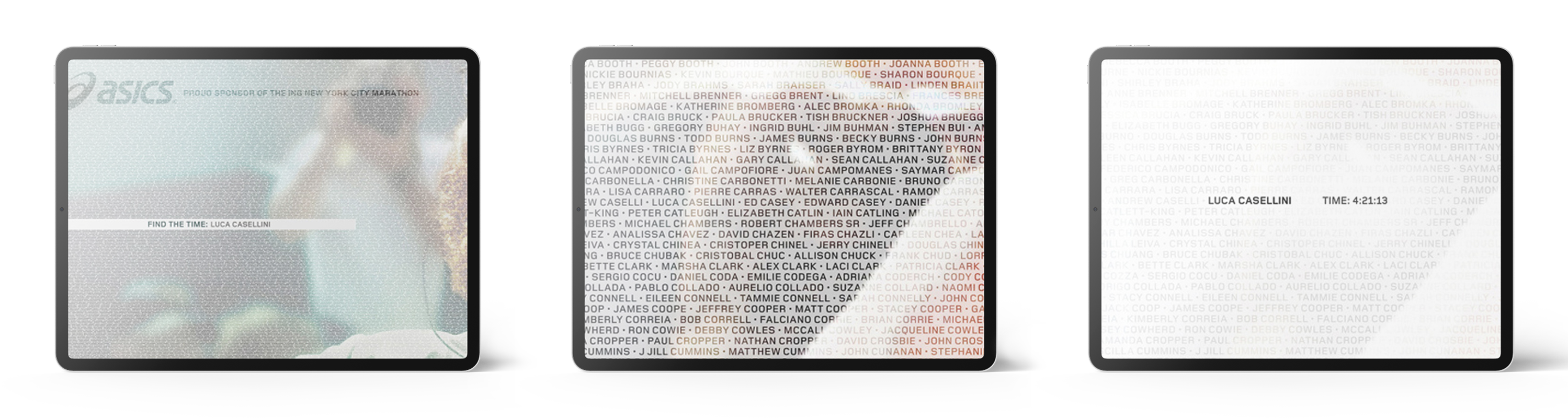 A few highlights are the Run With Ryan digital wall and the real-time run tracker. We created a video billboard in the subway tunnel showing Ryan Hall (top-ranked American marathoner) running at competition pace, allowing the audience to race against him…and better realize how incredible the pace over that distance really is. The time tracker gave you the ability to plug in the name of a marathoner and see their time as they are running.